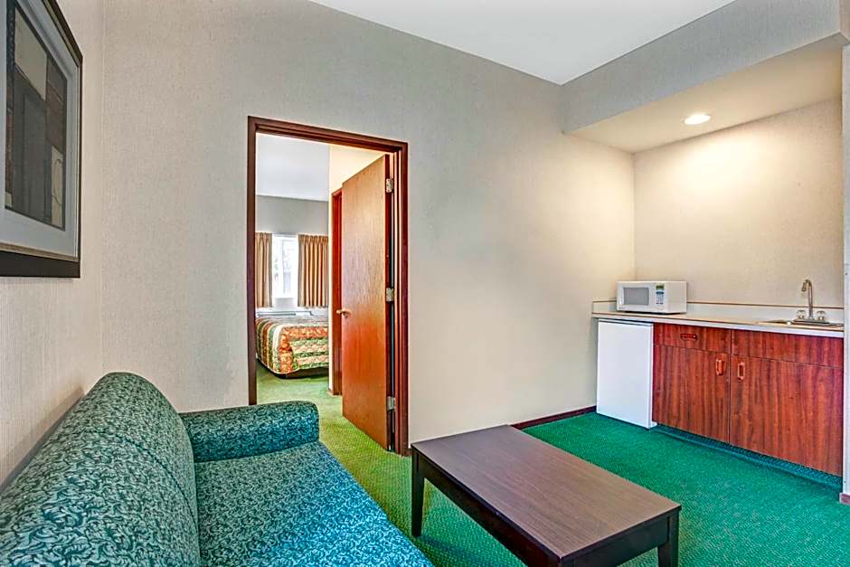 This suite has a separate bedroom, living room area with a sofa bed, a kitchenette area that includes a microwave oven and mini fridge.